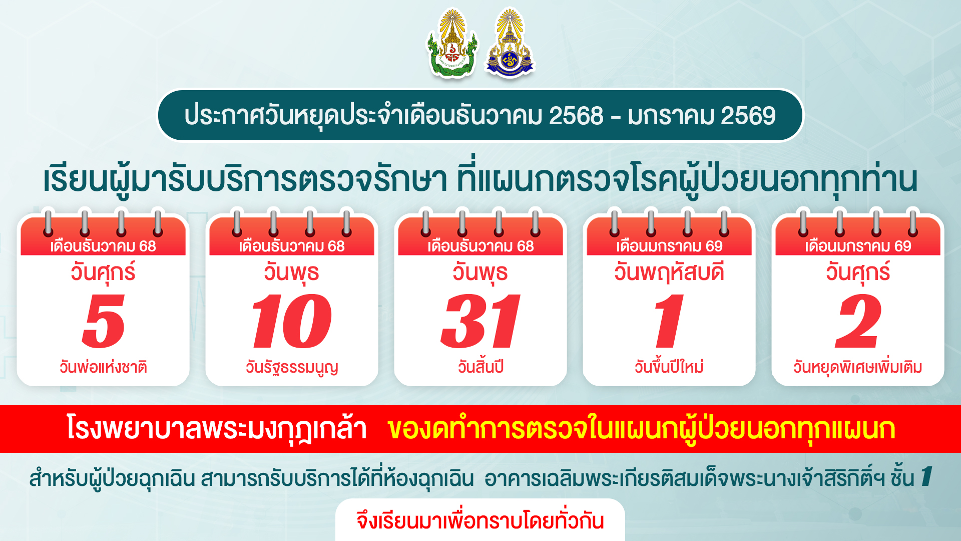 ประกาศวันหยุดประจำเดือนธันวาคม 2568 - เดือนมกราคม 2569