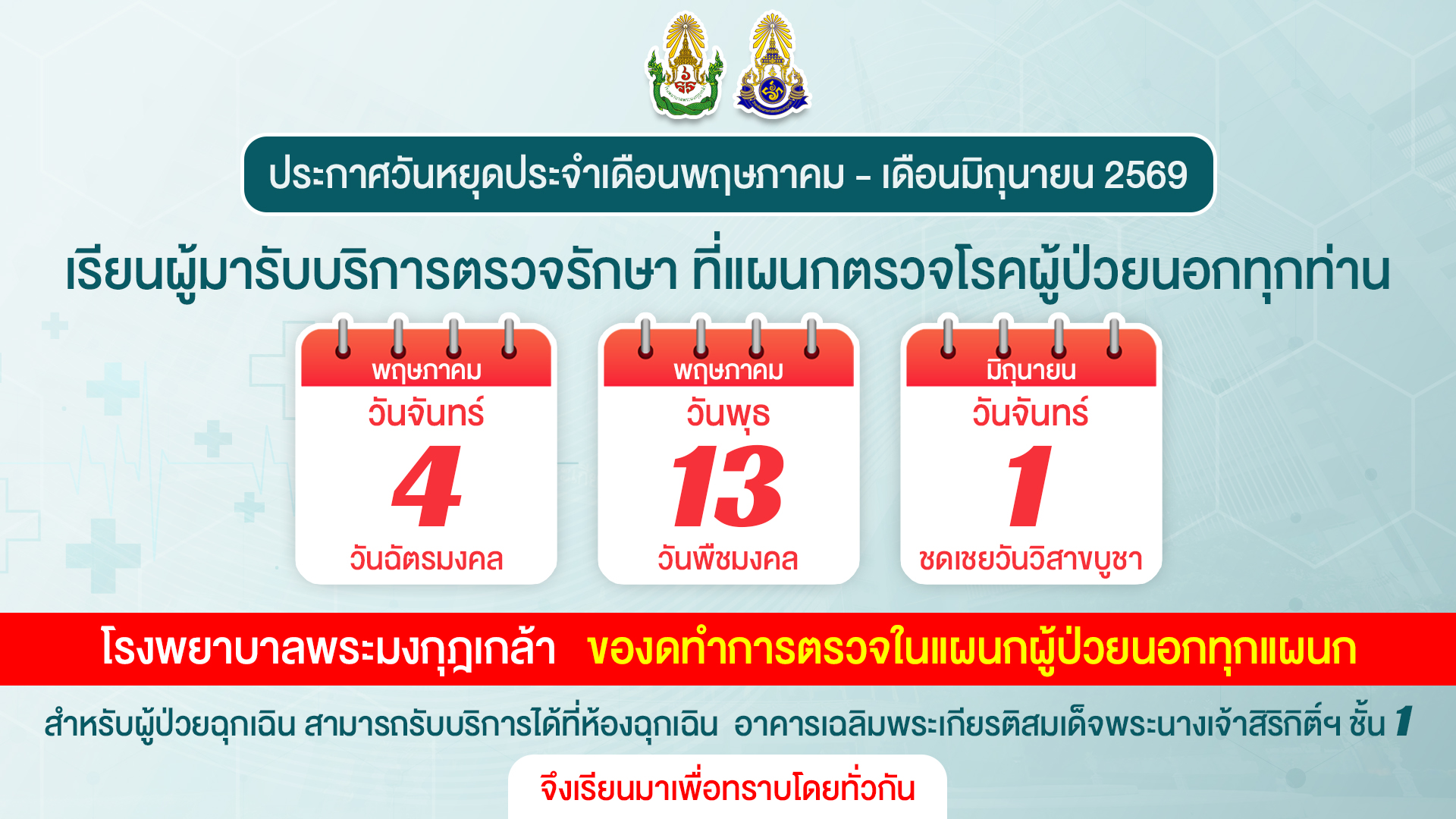 ประกาศวันหยุดประจำเดือนพฤษภาคม - เดือนมิถุนายน ประจำปี 2569
