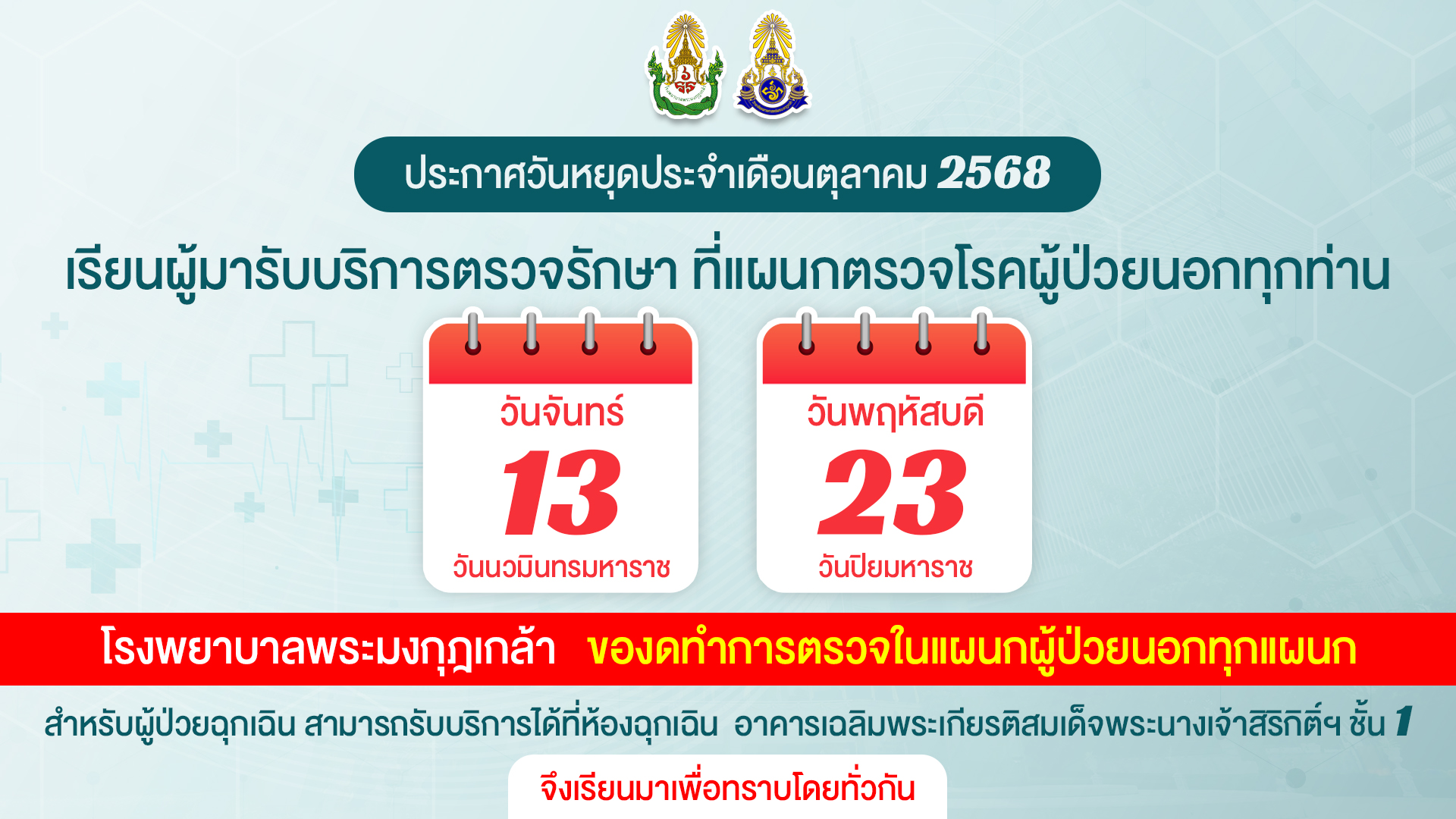 โรงพยาบาลพระมงกุฎเกล้าประกาศวันหยุดราชการประจำเดือนตุลาคม 2568
